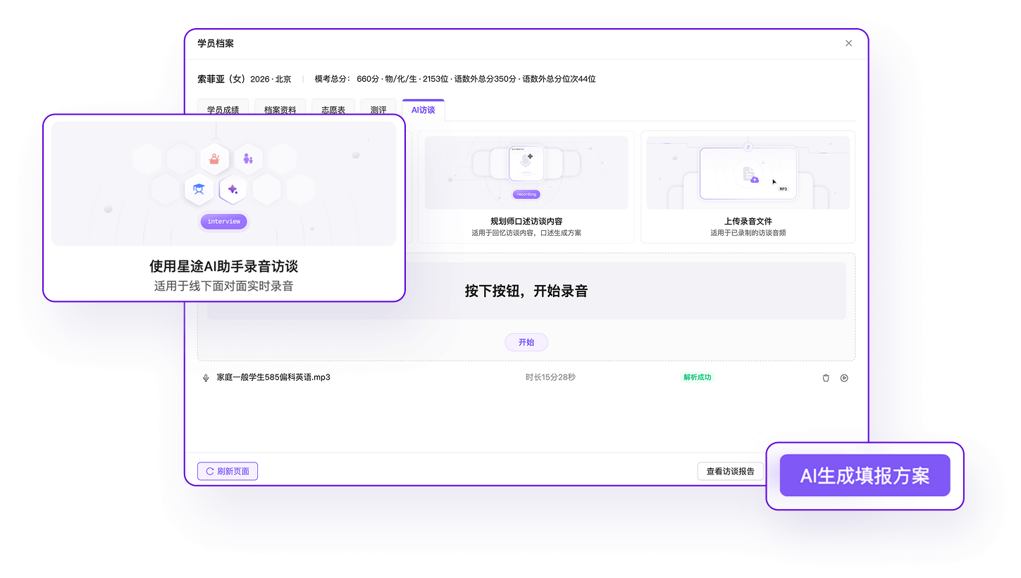 大模型实时分析访谈录音,获取学生的地域偏好、意向专业、家庭背景等核心需求,并生成访谈纪要和填报方案