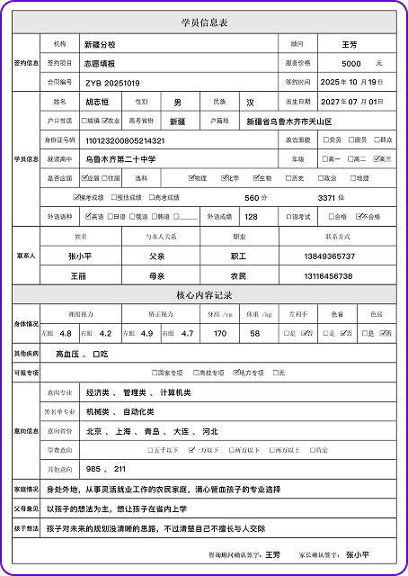 通过视觉大模型识别纸质学员信息表(成绩单、体检表、意向问卷),转化为电子档案并自动分类,为后续测评、填报提供数据支撑。